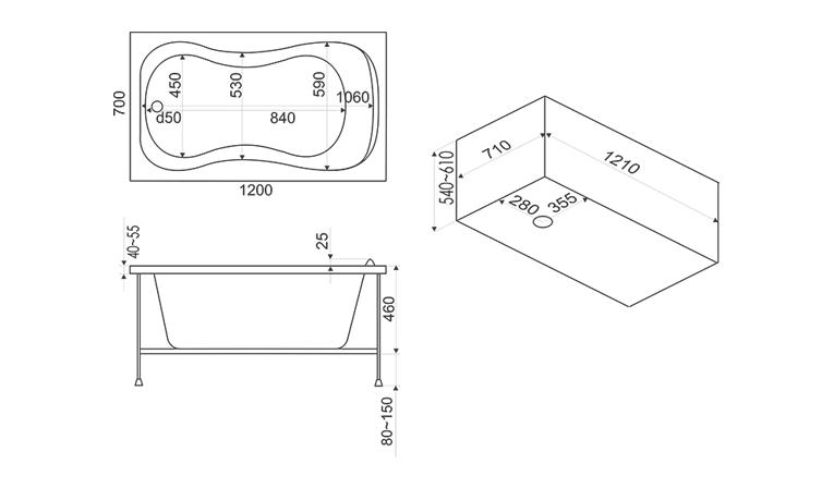 Глубина ванны по центру — 410 мм