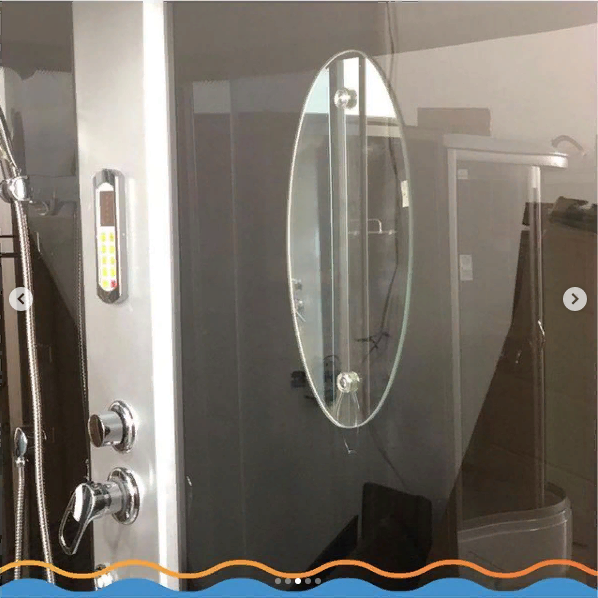 Алюминиевая рама, закаленное стекло 4 мм, без радио. 3-х режимный смеситель, ручной душ, верхний душ, 6 задних форсунок массажа.