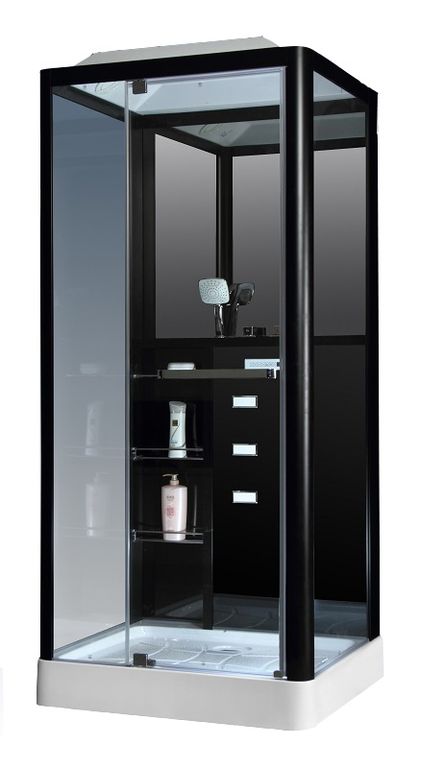 Алюминиевая рама, Закаленное стекло 6мм, управляется сенсорной панелью, радио, вентилятор, светильник, полка, смеситель 3 режимный кран, массаж ног, крыша с верхним душем, ручная лейка.