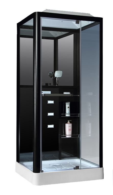 Алюминиевая рама, Закаленное стекло 6мм, управляется сенсорной панелью, радио, вентилятор, светильник, полка, смеситель 3 режимный кран, массаж ног, крыша с верхним душем, ручная лейка.