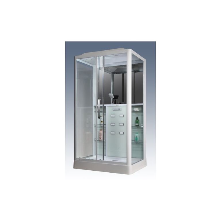 Алюминиевая рама, Закаленное стекло 6мм, управляется сенсорной панелью, радио, вентилятор, светильник, полка, смеситель 3 режимный кран, массаж ног, крыша с верхним душем, ручная лейка.