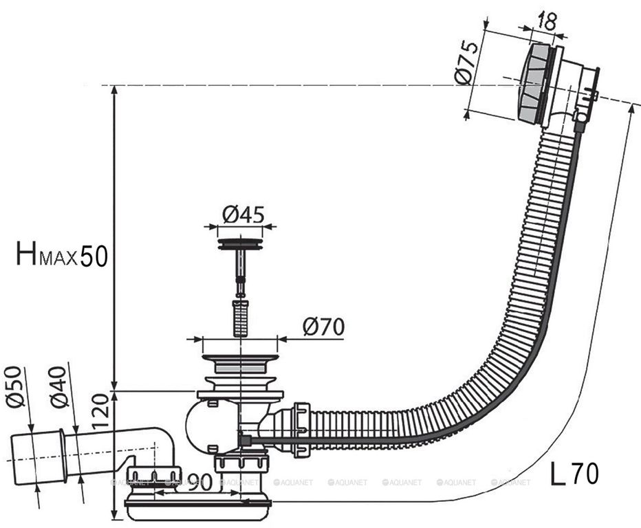 Сифон для ванны полуавтомат 1 1/2"х40, с гт 40х40/50 и пер.